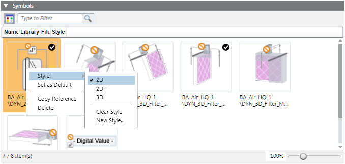 To define the library style, right-click the desired symbol and select Style: > 2D, 2D+ or 3D.